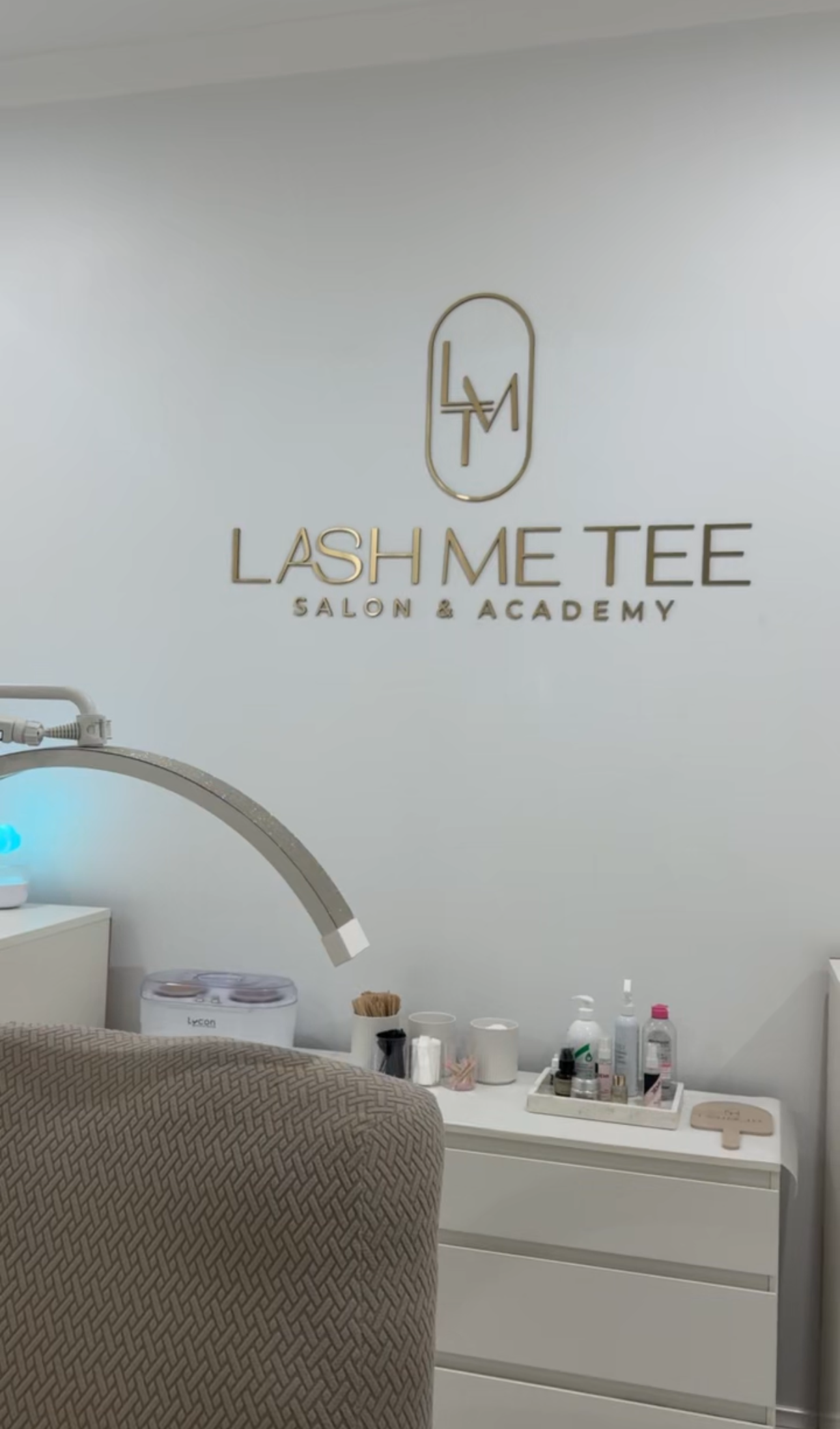 Every element was custom-measured and designed to suit the Lash Me Tee aesthetic — modern, clean, and confident. The gold finish reflects light beautifully throughout the room, creating a polished and cohesive brand experience for both clients and students.